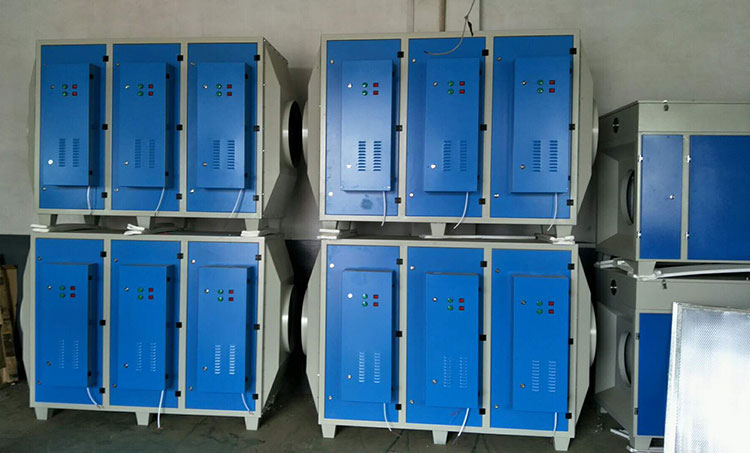 等離子凈化設備內部裝有獨特的碰吸單元,截留去除廢氣中的顆粒物質,廢氣收集系統收集的多元素氣體經過等離子活性氧凈化裝置,在高壓等離子電場的作用下,電離初始態氧將其中的廢氣離子進行電離荷電凈化,帶電的微小離子(塵埃粒子)被吸附單元所收集并流入和沉積到氣體處理裝置的儲塵箱內,氣體內的有害氣體被電場內所產生的臭氧所殺菌,并去除了異味,有害氣體被除掉,達到廢氣處理的目的。